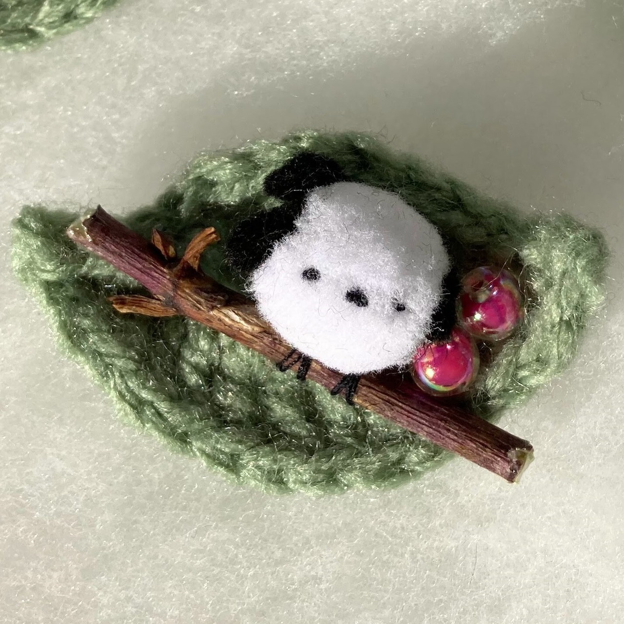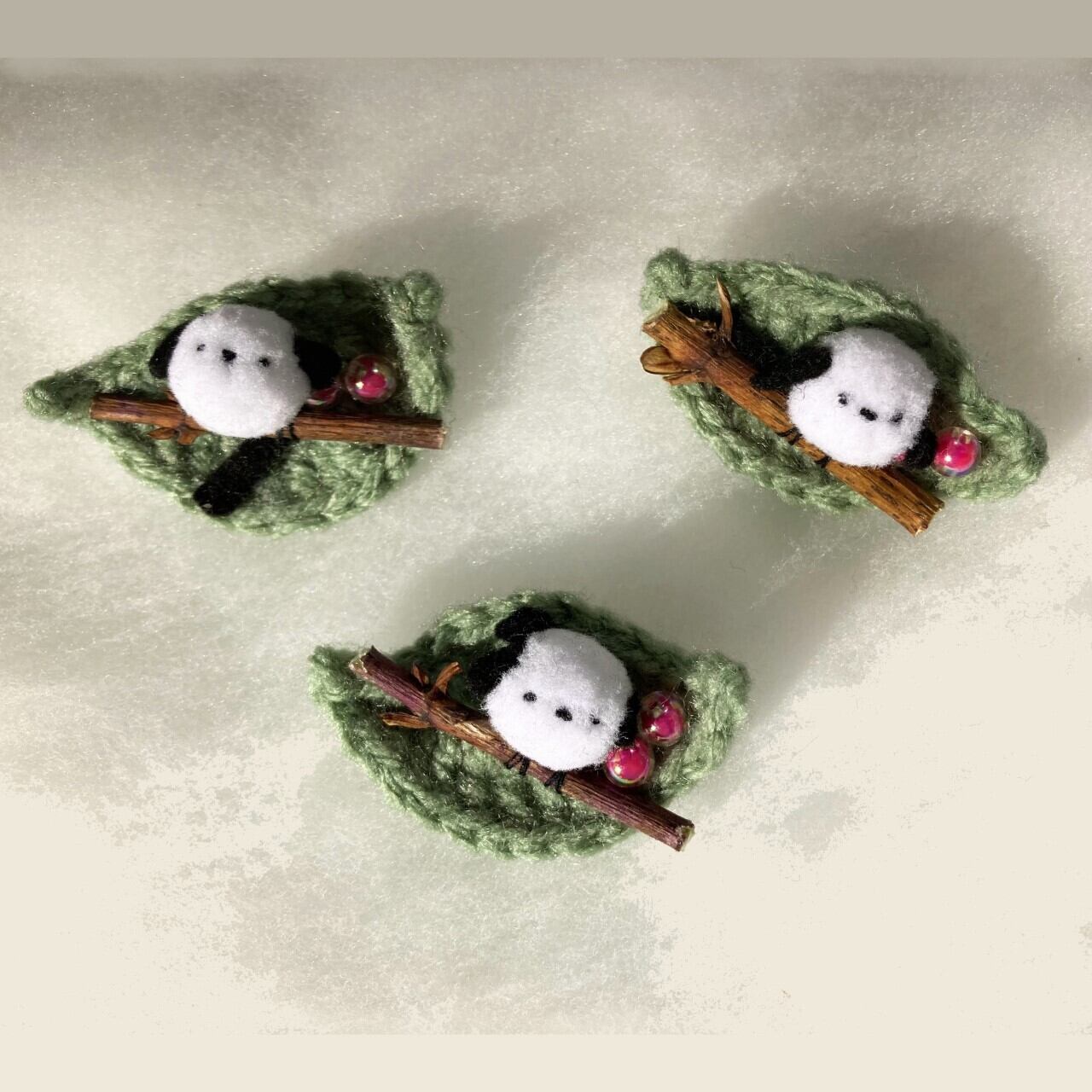 レース編みの葉っぱの上に、ポンポンのシマエナガちゃんが可愛くちょこんと乗ってます♪